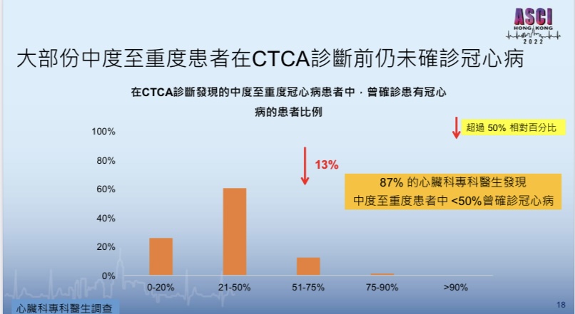 調查發現,大部分醫生認同相對2020年,於2021年心臟造影檢查個案均有增加,心臟電腦掃描和磁力共振的升幅約為11-30%,而87%心臟科專科醫生指中度至重度冠心病患者當中,超過一半為新確診的冠心病患者。