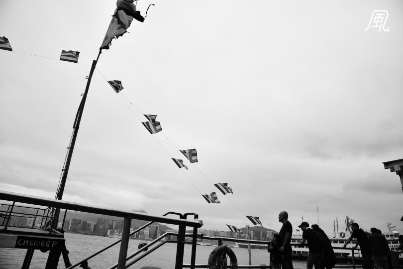 在北角碼頭,站在最前的一對相依父子,在旗幟飄搖下,毋懼風雲罩變。