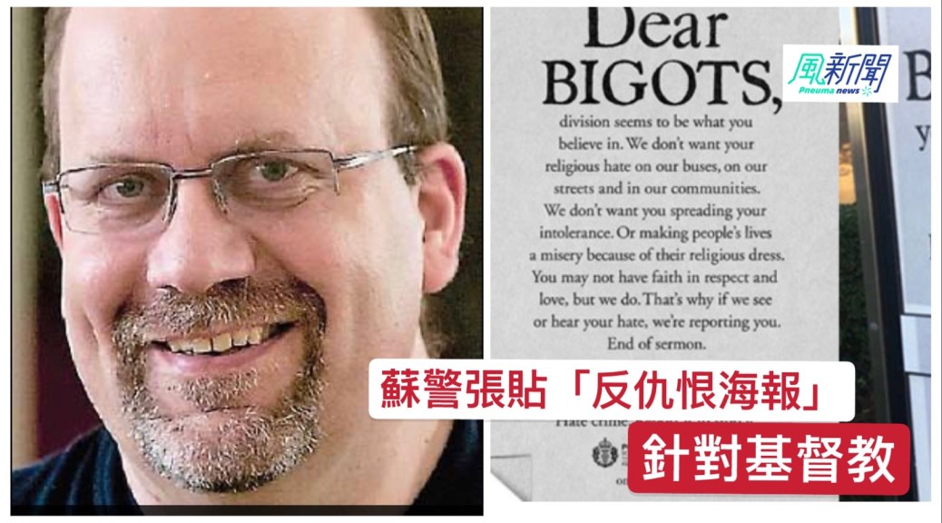 蘇格蘭警方在警署門外張貼海報,推動反仇恨,被指針對當地的基督教。海報以書信體裁設計,上款寫着「親愛的偏執狂(Bigots)」。西方流行以「偏執狂」一字,來形容那些反對同性戀的人,尤其是基督宗教的信徒。
