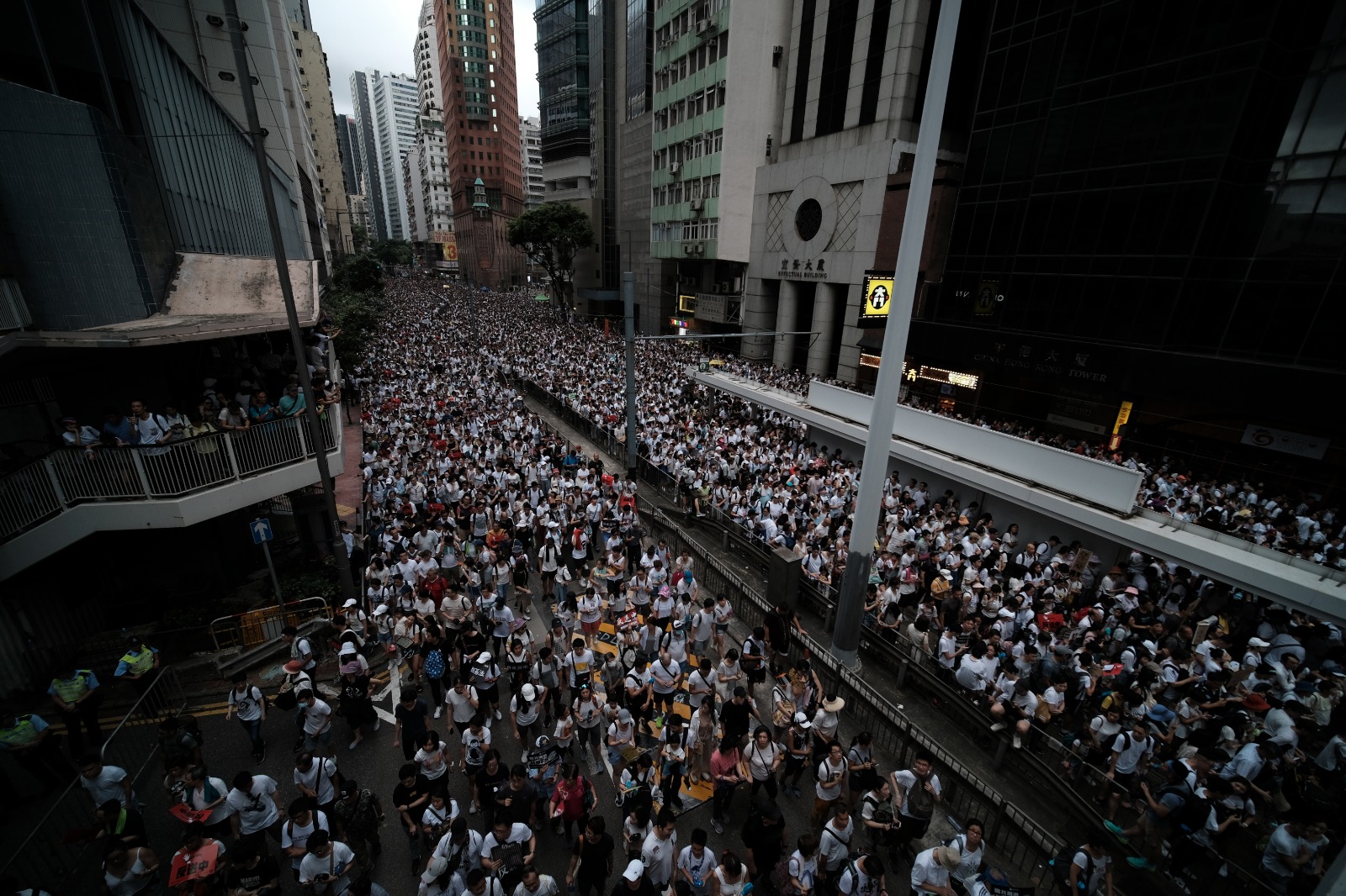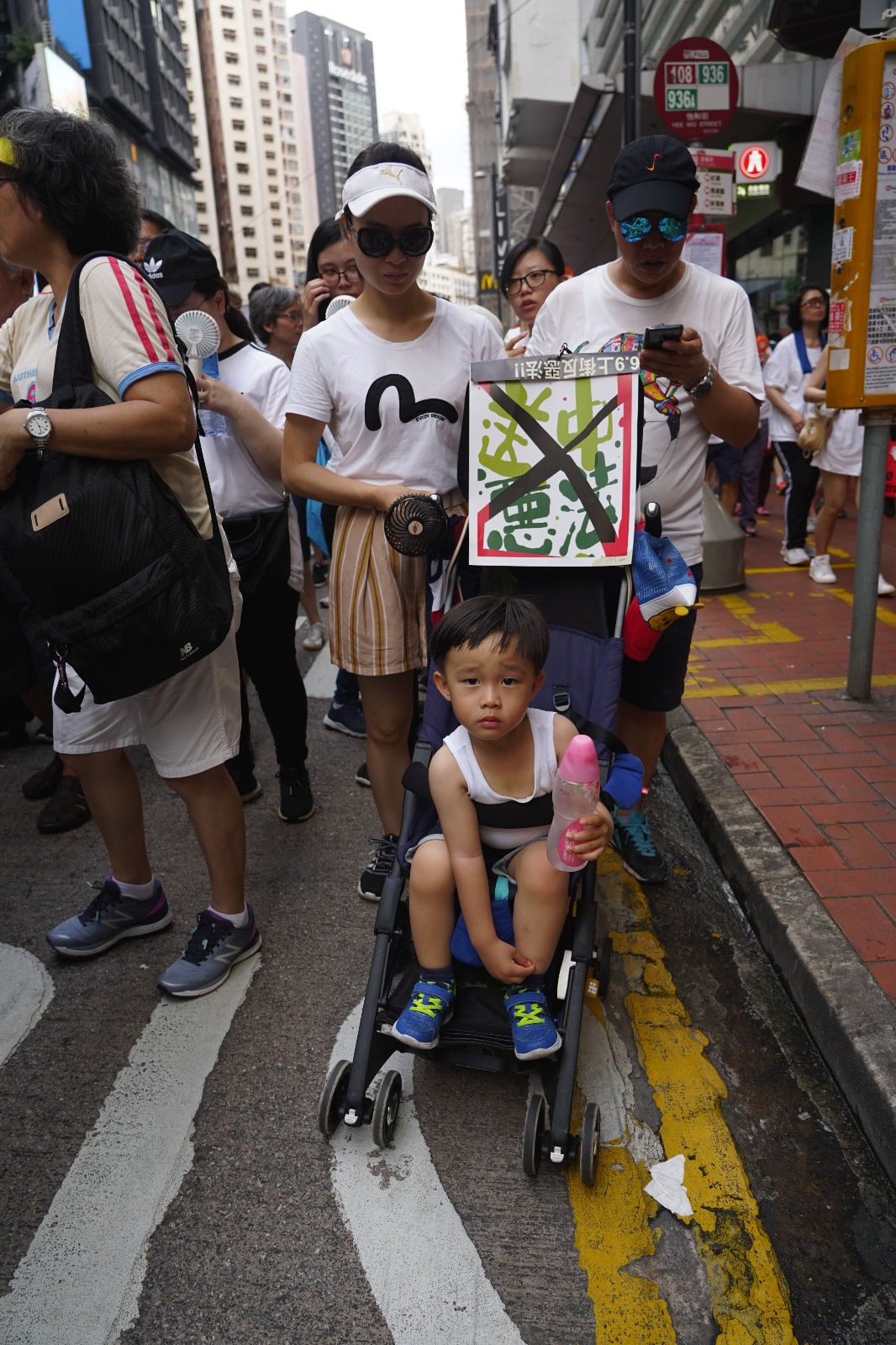 過了灣仔盧押道,可謂終點在望,轉眼就到遊行終點,但時至晚上八時,身旁八十後爸媽推著嬰兒車,經過一整日長徒拔涉,芭蕉扇已耗盡,加上金鐘樽頸位置收窄,人龍未及消化,媽媽心疼兒子太熱開始亂抓和大哭,最終她回頭說:「老公,你帶個仔回家抖抖,我可以堅持到最後」,說畢三人將嬰兒車推離馬路,消失在人海中。