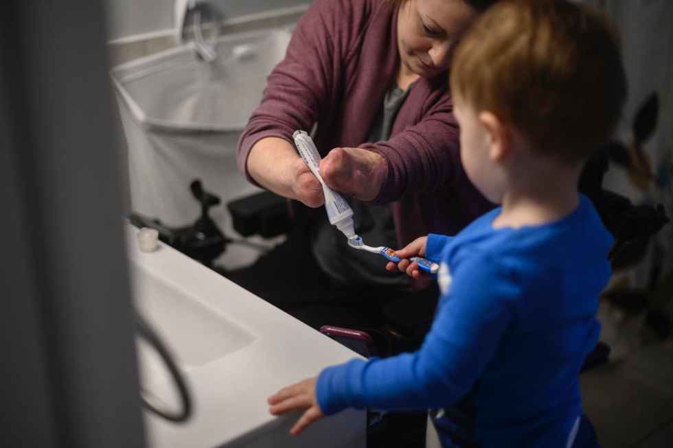 現在的琳賽雖然沒了四肢,但仍不忘照顧愛子日常生活。 (圖片來源:Topic網站)