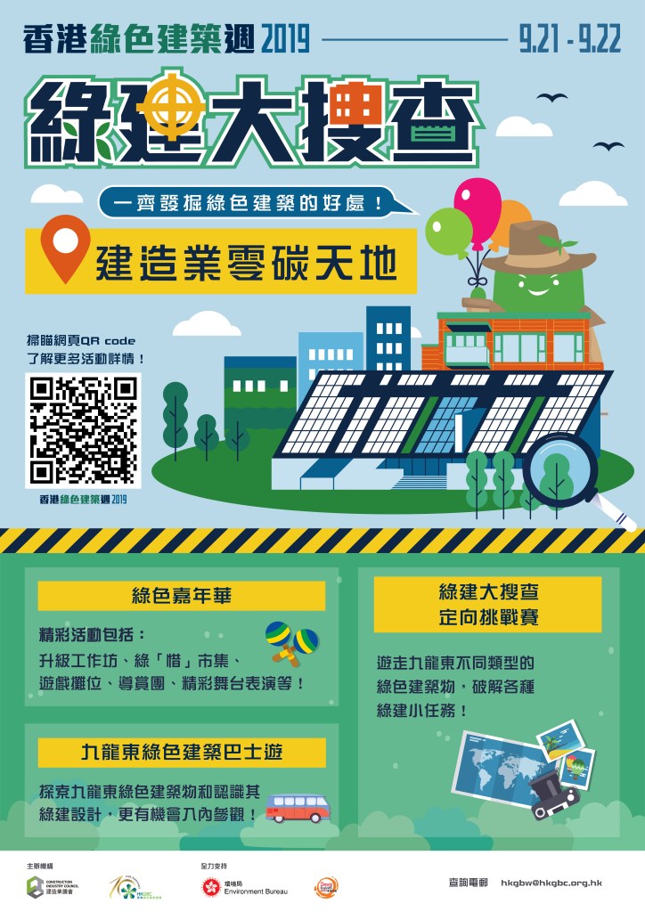「香港綠色建築周2019」包括舉辦兩項活動,其中的「綠色建築嘉年華會」將於9月21至22日、一連兩日於九龍灣的建造業零碳天地舉行。活動以九龍東的綠色建築為主題,九龍東新舊樓宇匯聚,更將發展成為富吸引力的未來核心商業區。