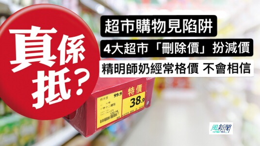 超巿購物又見陷阱,消委會今年一項調查發現,四間大型連鎖超巿利用「刪除價」和真實售價,營造抵買效果,但實際上那個「刪除價」並非原價,超過三間超巿的產品30日內從來未試過以刪除價出售,變相真實售價就是原價,那個「刪除價」成為假的抬高價,企圖營造大幅度拆扣優惠。消委會批評這類措施只為促銷,未有為消費者真正節省金錢。有精明者笑言,早就知道超巿出古惑,她建議大家必須格價,減少受騙。