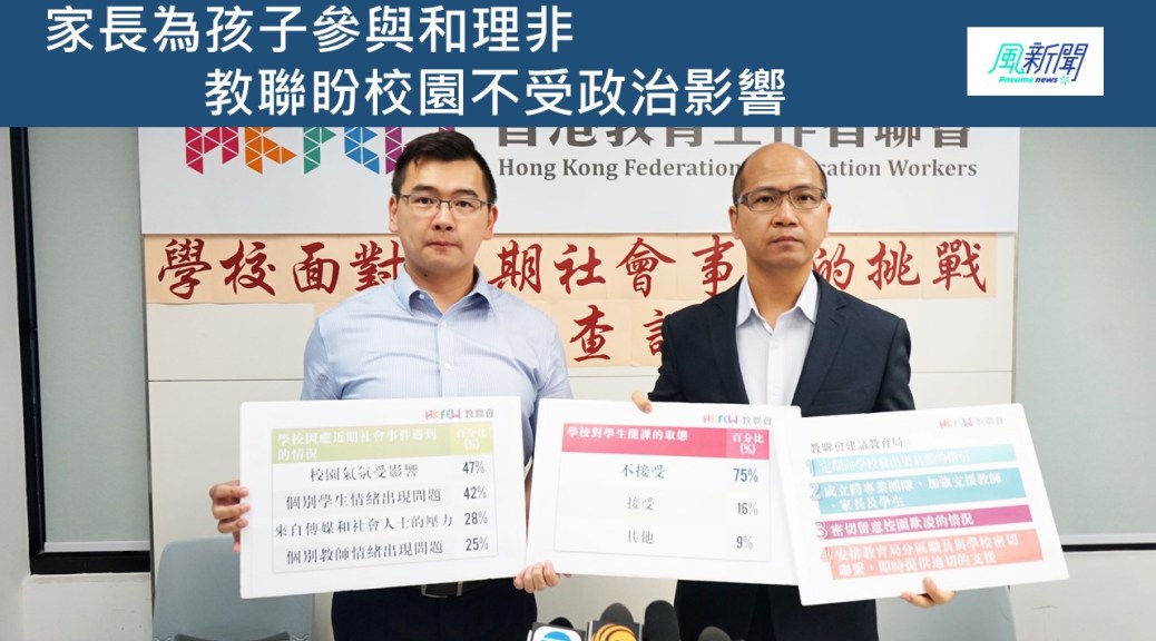 今年開學不少人擔心政治會滲入校園,教聯會調查顯示,原本以為會影響學校的罷課運動,最終沒有得到大部分在校學生支持,轉為較溫和的人鏈活動,學校的老師和同學大致能克制,但坦言有學生因為朋輩壓力而去遊行,有家長也會因為擔憂孩子安全而決定陪伴遊行,可見仍有影響。