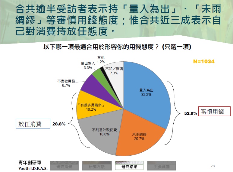 不過,他們的理財觀念仍有不足之處。合共近三成表示自己持「不刻意計較使費」(18.6%)或「有幾多用幾多」(10.2%)等放任消費態度;亦有受訪專家指部分青年或抱「今朝有酒今朝醉」的心態,缺乏理財動機。