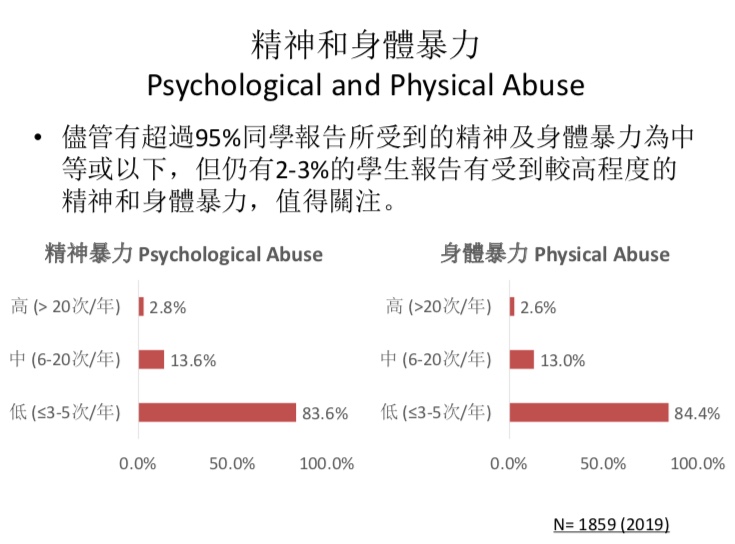 調查結果顯示,在1,859名受訪小學生中,27.6% 有中等或以上程度的焦慮、10.2% 有中等或以上程度的抑鬱。雖然有76.6% 小學生的幸福感指數為中等或以上程度, 但仍有23.3% 和10.2% 的小學生,分別顯示低幸福感和高孤獨感。同時,有超過2%的小學生表示受到家長嚴重的精神和身體暴力對待,此情況值得關注。