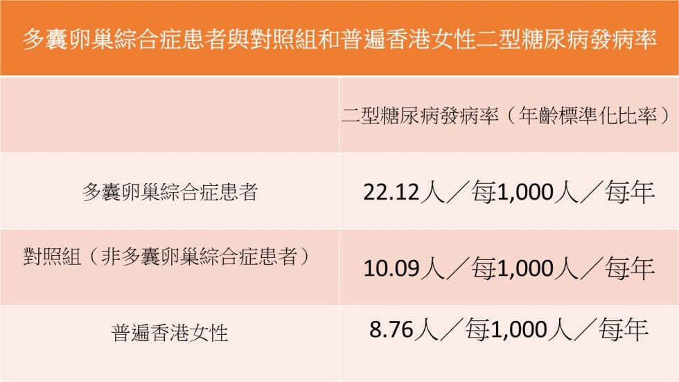 結果顯示,多囊卵巢綜合症患者普遍在10年後體重都有顯着增加,出現高血壓、高血脂或葡萄糖失耐症的人數亦有增長,當中約有五分之一演變成糖尿病患者。團隊計算出多囊卵巢綜合症患者的二型糖尿病發病率,見下表: