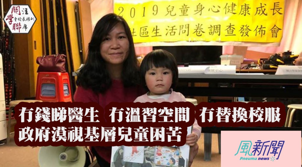 關注學童發展權利聯席早前進行「兒童身心健康成長及社區生活問卷調查」,共訪問240位基層家長,當中三分一受訪家庭每月總收入為$10000或以下,四分一為$10001-15000,每月平均家庭入息為$13,462。並發現基層兒童在衣、食、住、學習及醫療上極為困乏,當中包括: