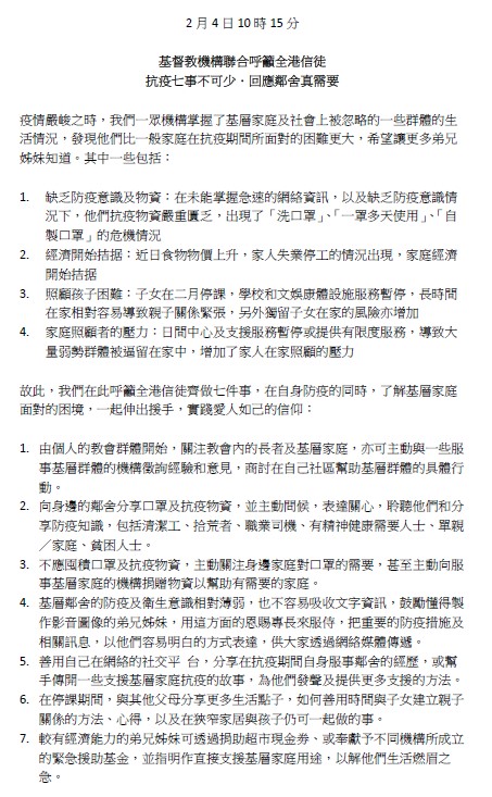 基督教機構因此發聯合聲明,呼籲全港信徒以「防疫七件事」關愛身邊的基層家庭: