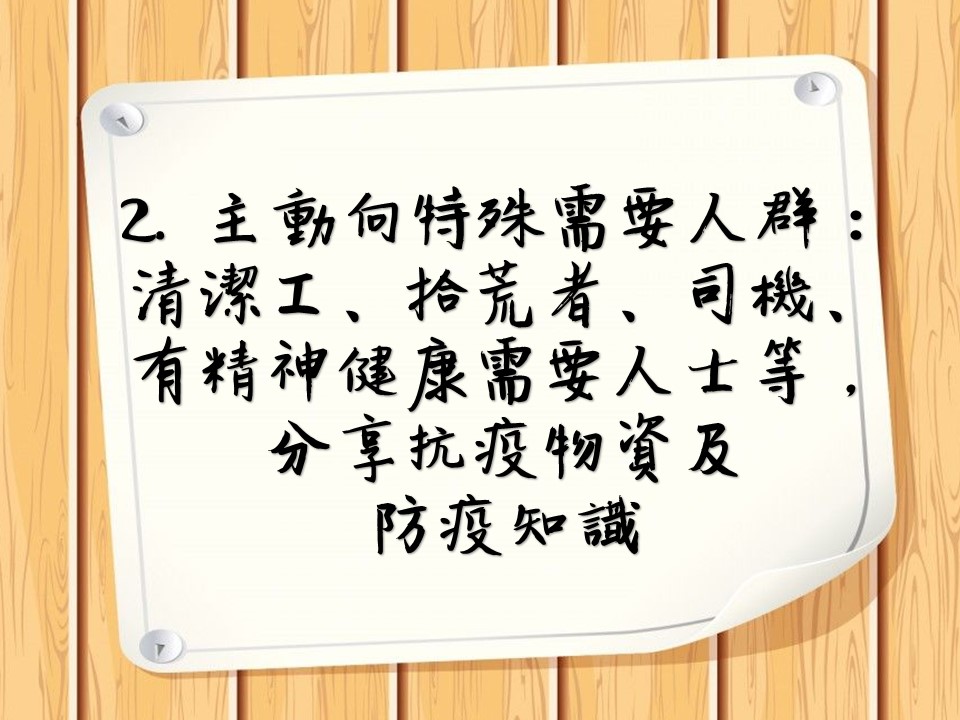 2. 主動向特殊需要人群:清潔工、拾荒者、司機、有精神健康需要人士等,分享抗疫物資及防疫知識