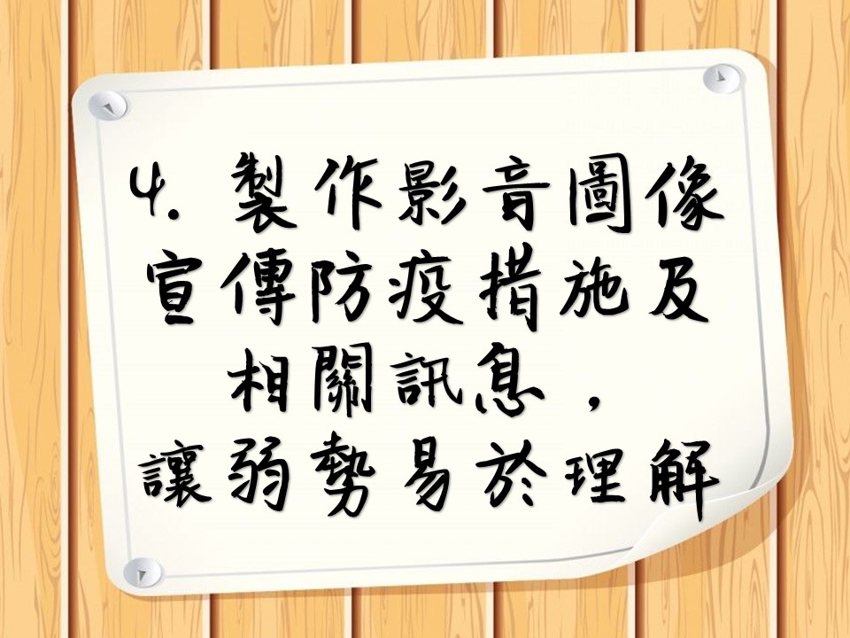 4. 製作影音圖像宣傳防疫措施及相關訊息,讓弱勢群體易於理解