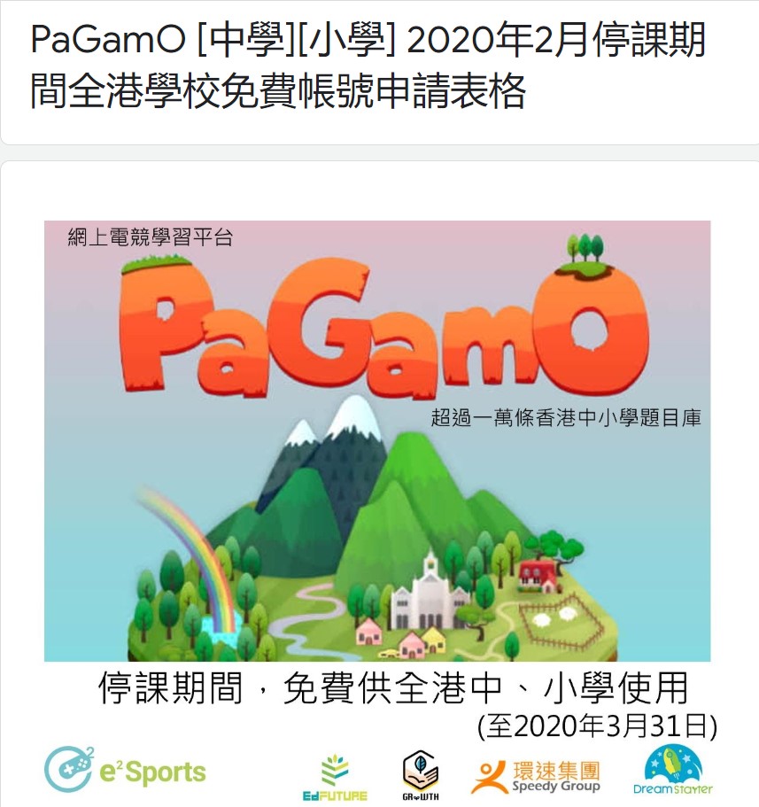 鑑於武漢肺炎疫情,教育局宣佈全港學校停課至3月2日,孩子無學返,留在家中可如何學習?「PaGamO」網上電競遊戲學習平台與香港的合作夥伴宣布於停課期間,站上超過一萬條香港中小學題目庫將免費提供全港中、小學使用至3月31日。在短短幾天內,香港就有230家小學、90家中學申請使用。