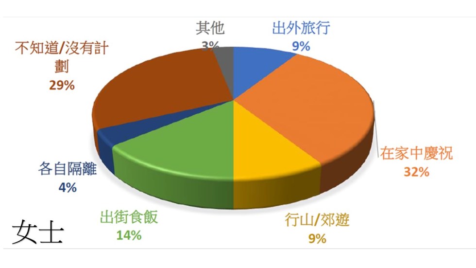 調查結果發現,3成男女冀在家中過情人節,而分別有15%男士及4%女士指會各自在家隔離。HKRD指是次結果對比2018年聖誕節作的類似調查差別大,當時未受社會事件和肺炎影響,9成男士、8成女士均表達會外出用膳慶祝,但是次調查過程,HKRD創辦人Yubi Wong形容氣氛是「戰戰兢兢」,不少受訪者沒有確切的慶祝計劃,原因是「想睇定D先」。