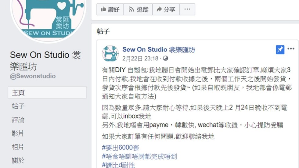 由香港資深時裝從業者創立的平台「Sew On Studio裳樂匯坊」,除已生產數百個男女裝及童裝HK MASK,昨天於其Youtube頻道上已發布「製作HK mask教學」,亦供應「DIY自製包」予想要參與製作的市民。