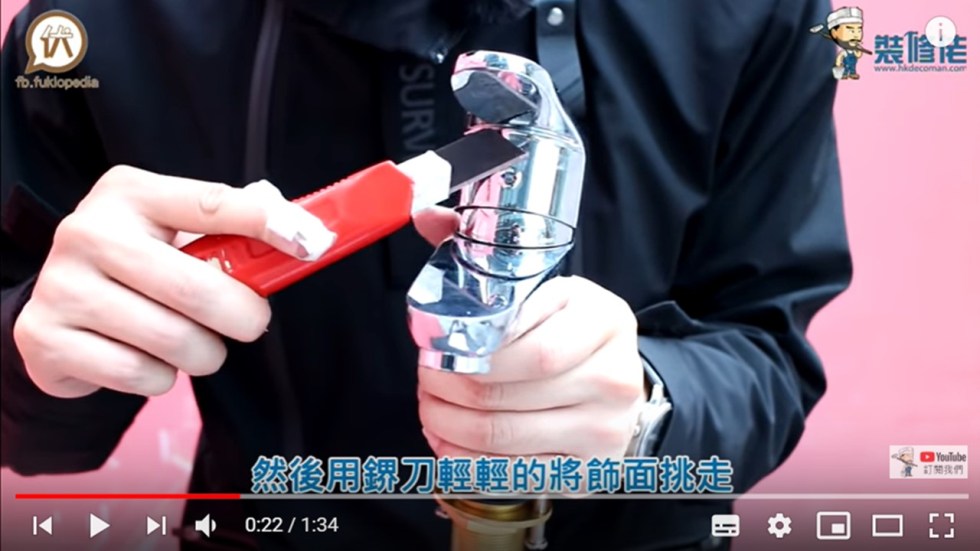 逆時針扭出飾面後,會看見迫件。這迫件於家裡使用中的水龍頭會擰得比較緊,須先用毛巾包好,再用鉗慢慢扭出,不要用「死力」。來到這步,已能夠見到水芯。