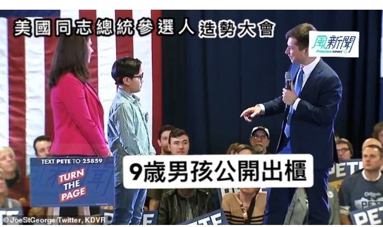 美國民主黨的總統候選人初選,其中一位參選人皮特(Pete Buttigieg )上月(2月23日)的一場競選集會中,一位9歲的男孩撒迦利(Zachary)寫下他的問題:「你可以幫助我告訴這個世界我也是一個同性戀嗎?我也想像你一樣勇敢」。