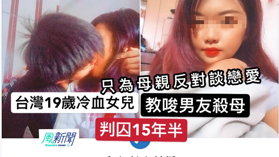 台灣一名19歲的女子,在網上認識了20歲的男子,雙方墜入愛河後,遭到家長反對。女子生心不滿,傳簡訊給男友,竟教唆他殺害自己的媽媽。後來男友果真拿刀子,跑到市場殺死女友媽媽,法院一審依殺人罪判男的有期徒刑13年8月,褫奪公權7年;身為直系血親的女兒,則被判有期徒刑15年6月,褫奪公權8年,全案還仍可上訴。