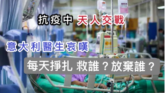 意大利由於新冠肺炎患者人數眾多,當地醫療體系承受不了;醫生柏德里尼(Michele Boldrini)悲嘆,現在意大利的病床、醫療用品及氧氣設備嚴重不足,每天都要陷入被迫選擇救誰、放棄誰的天人交戰中。
