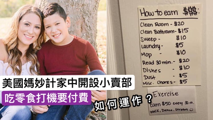 這位美國媽媽Stephanie Craig因要在家工作,為了不讓小朋友騷擾她,她在家中開設了臨時小賣部,架上放有各式各樣零食,還有打機時間,且全都標貼上價錢,如果小朋友要吃零食和打機就要付費。STEPHANIE其後分享,他們的親子關係因此更加融洽,兒子亦樂意去「賺取」小賣部的食物。