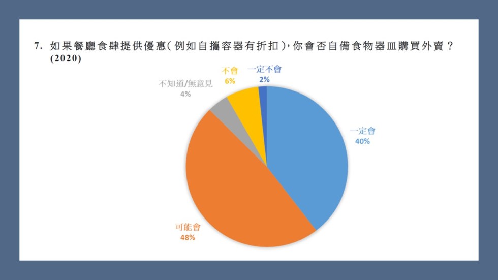 綠領行動於2020年4月1日至6日,以網上形式進行問卷調查,總共收集了2,008份回應。調查結果顯示,疫症後港人一周購買外賣次數上升55%,由疫症前每周買約1350萬次外賣,至疫情期間一周購買約2110萬次。外賣份數亦急升74%,即由疫情前每周約2710萬份,至疫情期間約4710萬份。