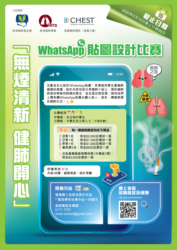 為提升大眾對胸肺健康的關注,香港胸肺基金會、香港胸肺學會及美國胸肺學院(港澳分會)合辦「無煙清新健肺開心」為主題的手機whatsapp貼圖設計比賽。