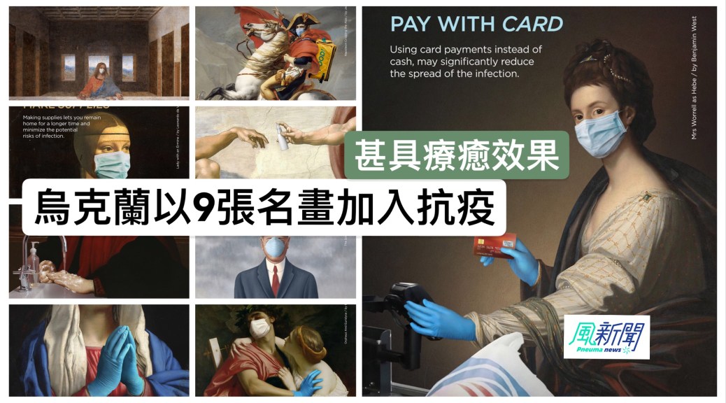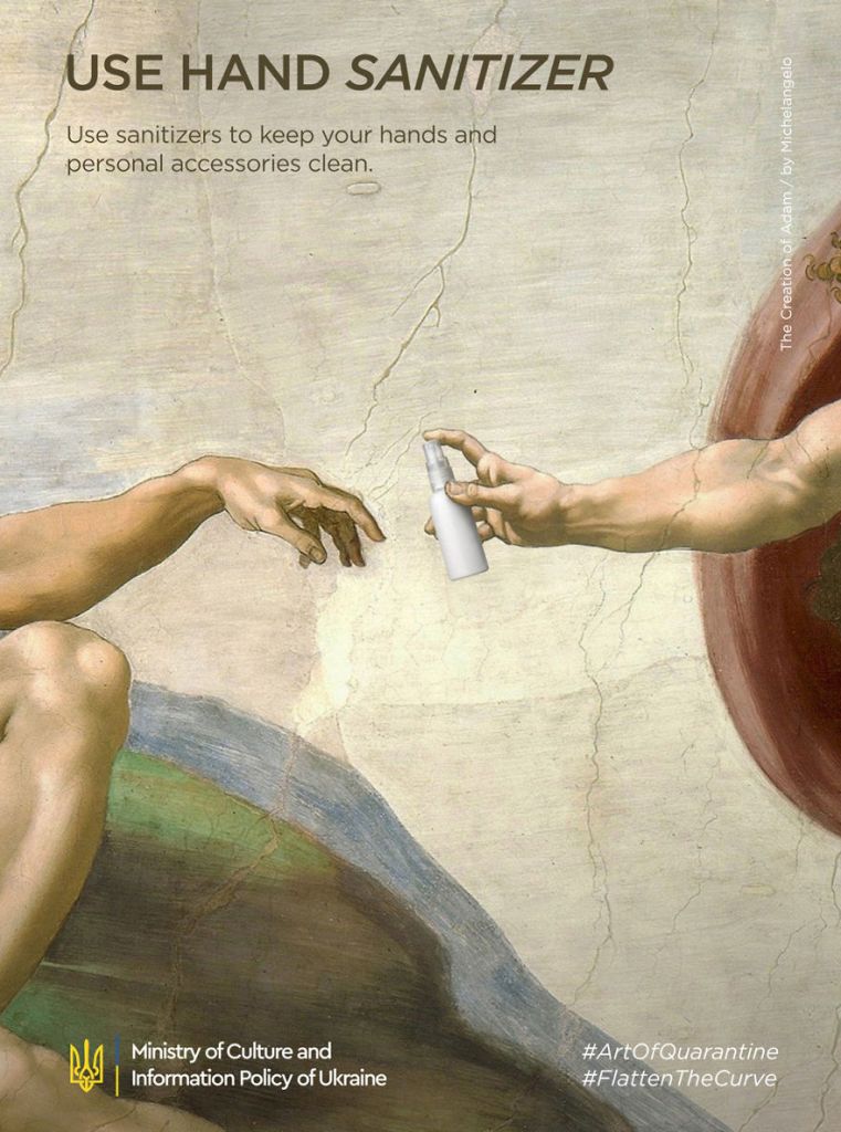 烏克蘭文化及資訊政策部發布了由一間廣告公司LOOMA製作的一系列防疫廣告,其實當地發起的「隔離的藝術」(Art of Quarantine)活動之一,製作公司利用9幅古典藝術名畫,巧用創新手法,以電腦技術改圖,加入洗手、戴口罩、保持社交距離,以信用卡取代現金等等資訊。