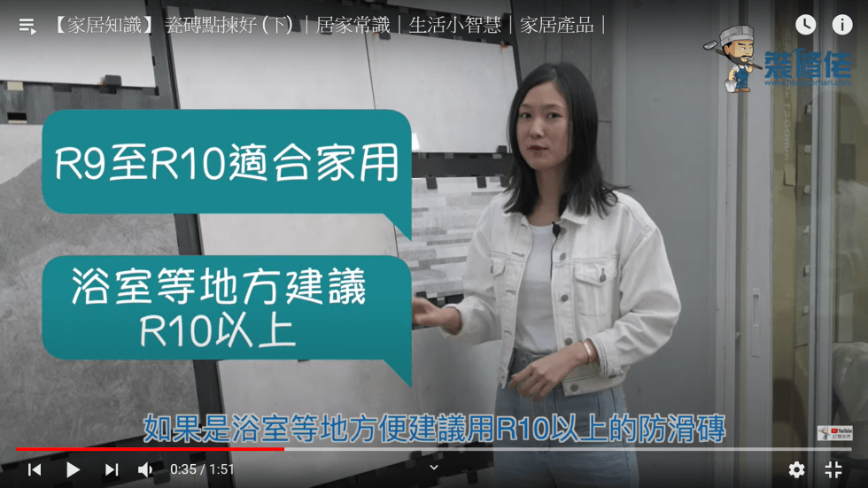一般家用R9至R10已適合,若是浴室等地方便建議用R10以上的防滑磚。