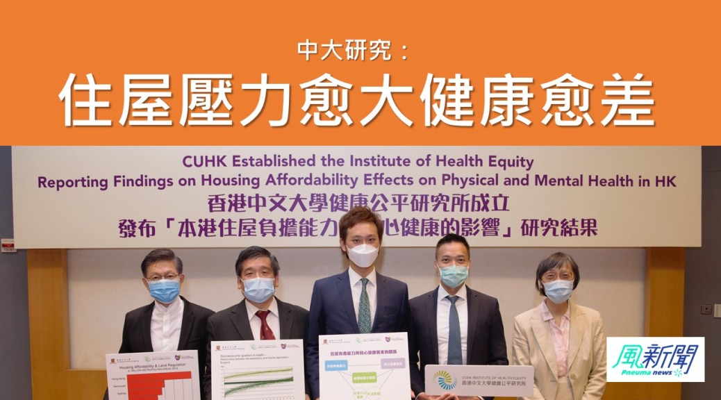 中大發表亞洲地區首個探討住屋負擔能力與身心健康關聯的「健康公平」研究。研究團隊於2014年至2015年間訪問了1,978名本港成年人,研究中的「住屋負擔能力」以受訪者個人剩餘收入方式計算,即扣除住屋費用後的可用收入,少於1.1萬元的為第一組,多於2.9萬元的為第四組。