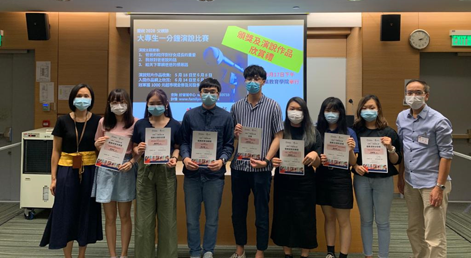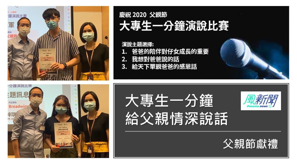 維護家庭基金主辦「慶祝2020父親節——大專生1分鐘演說比賽」,頒獎禮已於6月17日完成。比賽時段由5月18日至 6月8日,參賽者在這期間提交不多於90秒、親身在鏡頭前演繹的短片,可以下三演說主題自選其一: