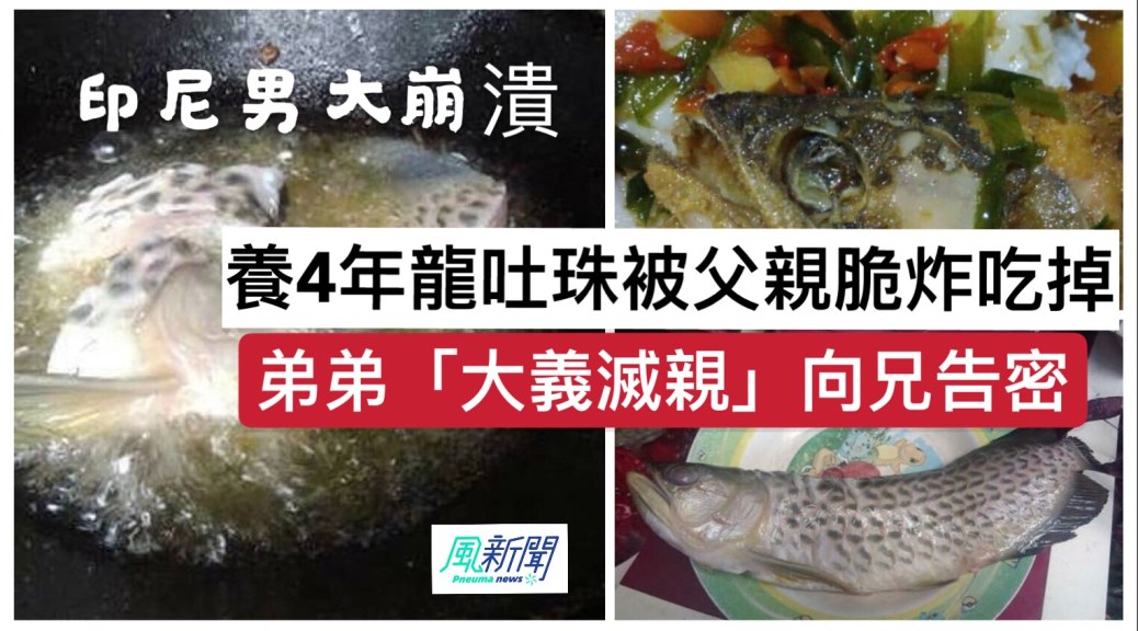 印尼一名男子兩年多年前買來一條龍吐珠來飼養,養了兩年,因家中魚缸已裝不下,於是把魚放在父母家中寄養,沒想到最近父親把龍吐珠炸了並吃掉,弟弟「大義滅親」,向他舉報,看到照片後,令他完全崩潰。
