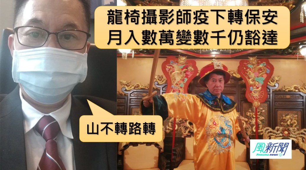 珍寶海鮮舫「龍椅」攝影師黃世貴,暫別攝影事業轉投保安,由月入數萬變數千,卻心境正面,仍覺「山不轉路轉」。