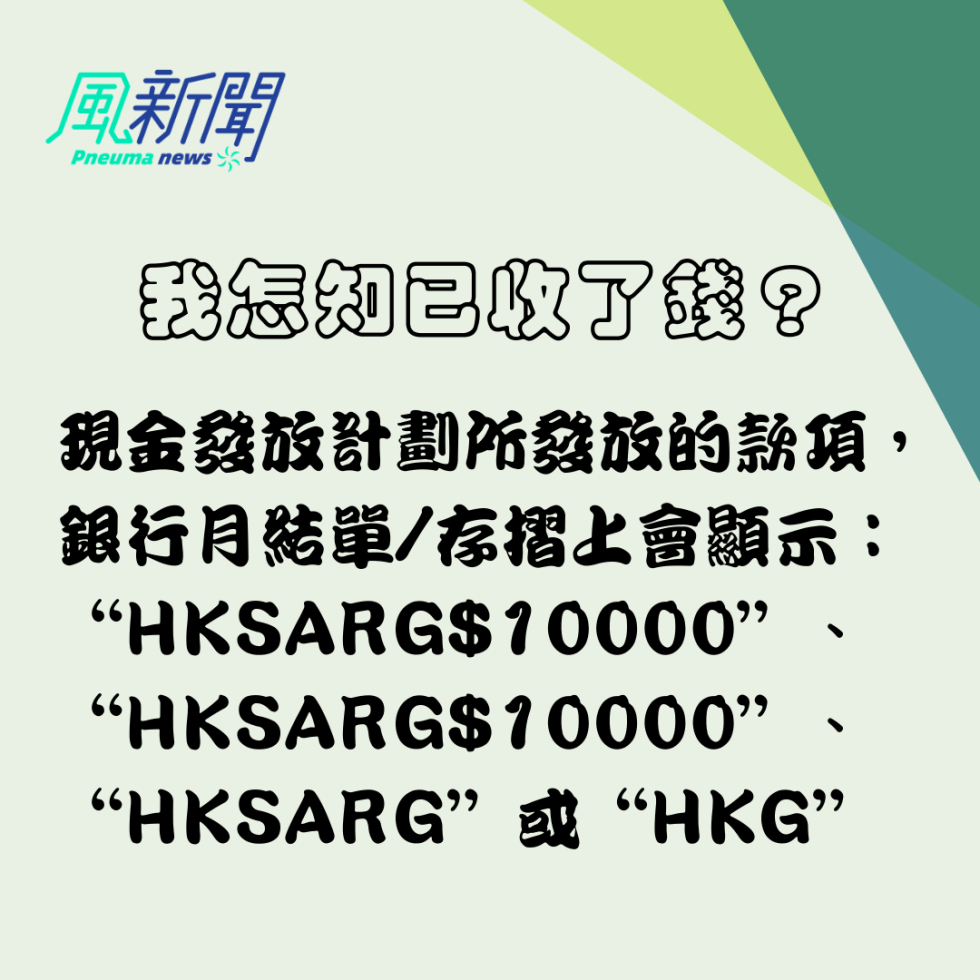 答:經由現金發放計劃所發放的款項,銀行月結單上會顯示“HKSARG$10000”字樣,而銀行存摺上則會視乎個別銀行的打印格式而顯示“HKSARG$10000”、“HKSARG”或“HKG”字樣。
