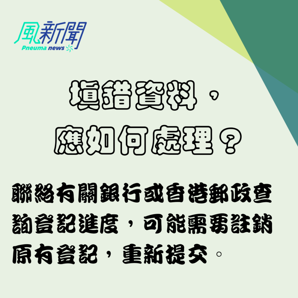 答:聯絡有關銀行或香港郵政查詢登記進度,可能需要註銷原有登記,重新提交。