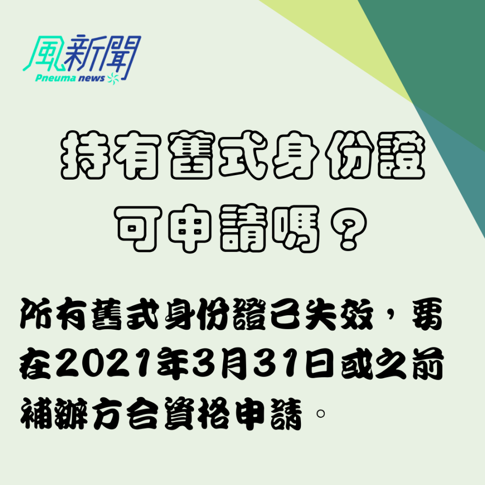 答:所有舊式身份證已失效,要在2021年3月31日或之前補辦方合資格申請。