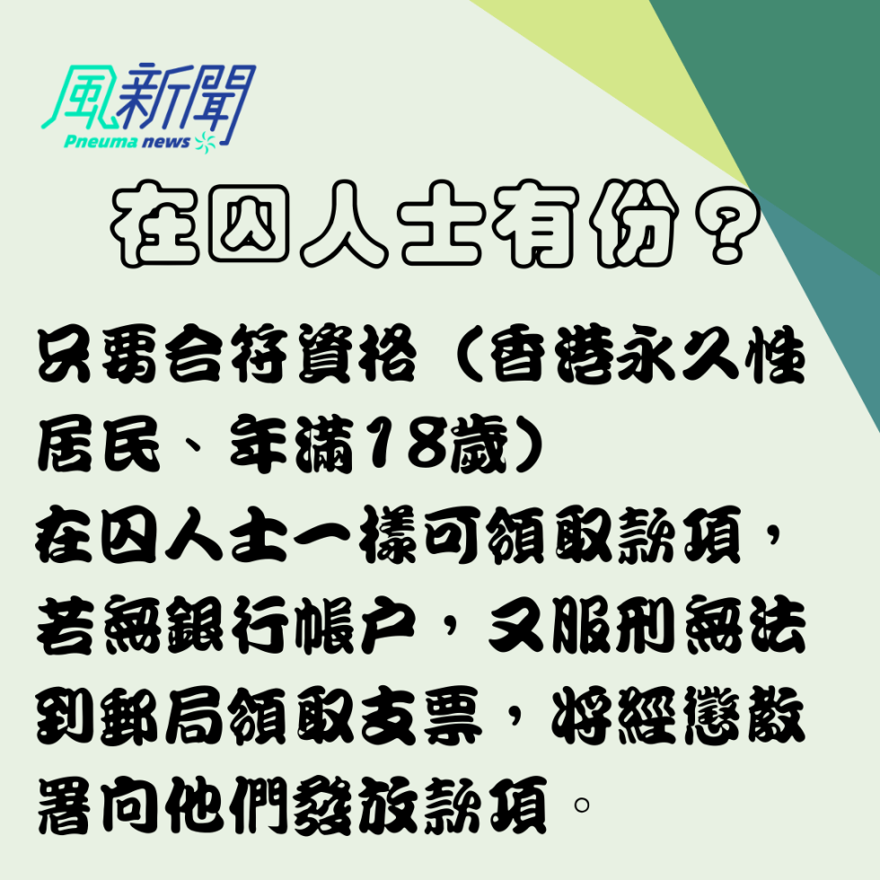 若他們沒有銀行帳戶,又因刑期較長而不能在領取支票的時限內親自到郵政局領取支票,可經由懲教署索取特定登記表格(表格4)填寫,並在確認符合資格準則後經懲教署向他們發放款項。