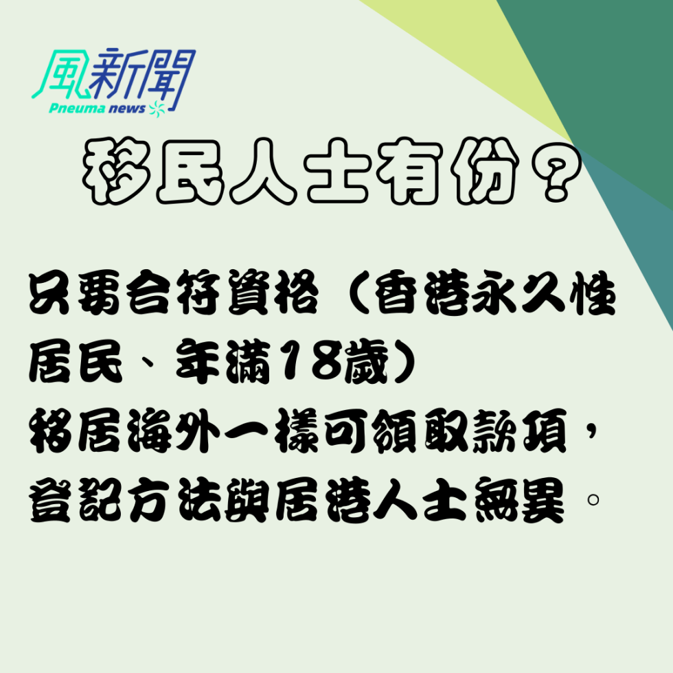 答:即使已移居海外,只要符合香港永久性居民資格並年滿18歲,一樣可透過本港個人戶口或郵政居領取一萬元,登記方法與居港人士無異。