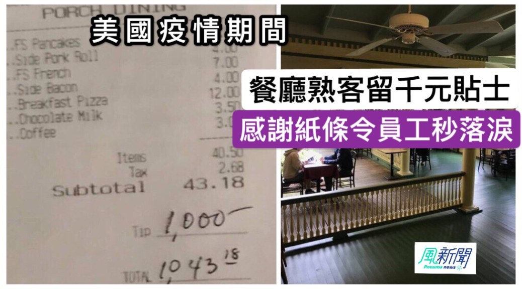 新冠病毒肺炎疫情打擊全球經濟,零售、飲食等行業首當其衝。美國新澤西州一間已開業21年的餐廳最近在網上分享一段令人感動的事,1名善心熟客結帳時默默地留下1000美元小費,以及一張寫滿感謝和打氣說話的字條,讓一眾苦苦努力多月的餐廳員工忍不住落淚。