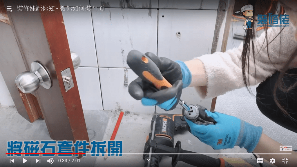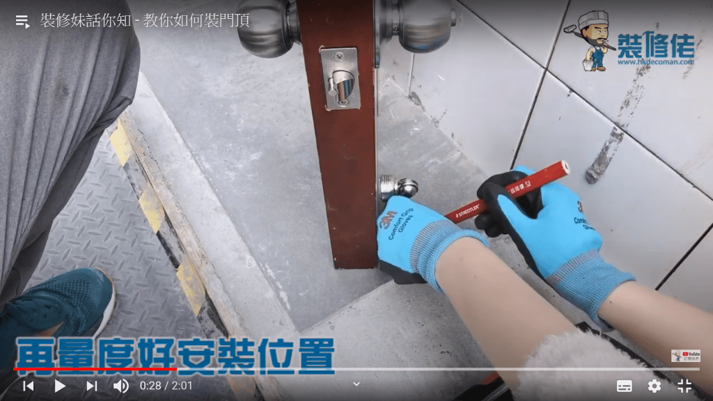 用門頂量度好安裝位置,決好與牆身的距離,以顏色筆畫定位。