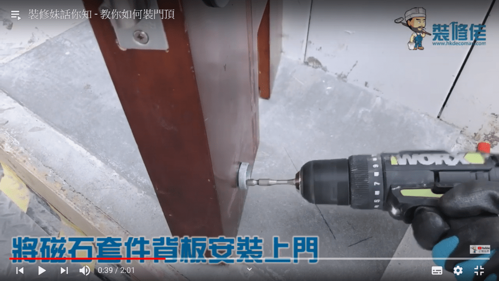 將磁石套件背板,安裝在門背已畫定位處。固定好後,再將磁石部份組裝上。