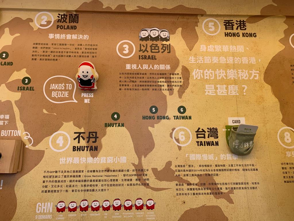 牆上寫滿不同國家地區的「快樂秘方」,牆上附神秘按鈕,按下後會聽到異國語言說出的祝福或勉勵說話。