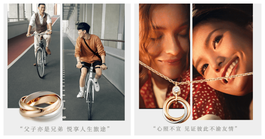 卡地亞 (Cartier) 10日在微博發佈一條1分鐘長的廣告影片,宣傳經典戒指款式「Trinity」三環戒,三對主角分別為異性戀伴侶,以及分別共聽音樂、共有騎單車的「男男」、「女女」組合。