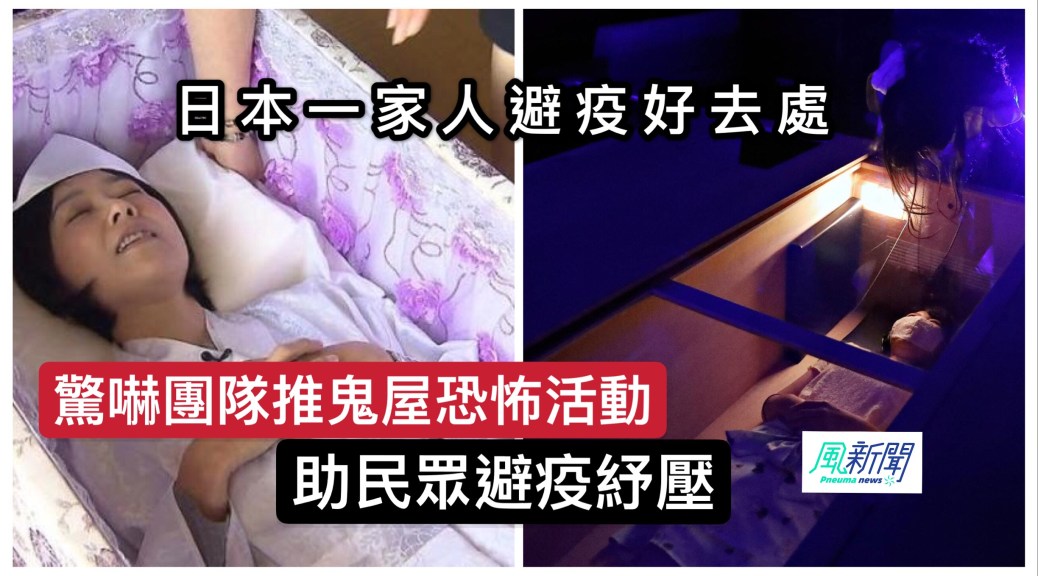綜合外電報導,日本流行鬼屋玩意,全國各地有主題樂園推出這些活動,而鬼屋和恐怖活動策劃公司「驚嚇團隊」就靈機一動,覷準民眾心理,搞搞新意思,並藉此減壓。參與者會躺在一個2公尺長且有塑膠窗的棺材內聆聽鬼故事,觀賞窗外演員扮演鬼怪在一旁圍繞,過程中還會被假手碰觸,或突然被噴水。該公司25歲專業演員岩名健太(音譯)表示:「疫情令人感到壓力沉重,我們希望參加者可以透過放聲尖叫紓壓。」