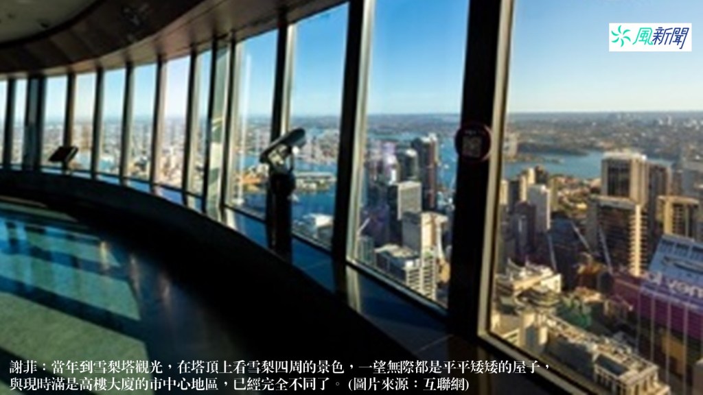 初初到步以後幾天一家人到雪梨市中心的溫雅(Wynyard)區,爸爸帶我們去銀行、郵政總局辦事,然後到雪梨塔觀光。在塔頂上看雪梨四周的景色,發現原來(當時)只有少量的高樓大廈在市中心區,其他地方一望無際都是平平矮矮的屋子,心裏突然覺得香港原來是頗為先進的,因為到處都是高樓大廈。