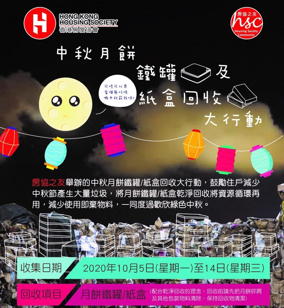 房協之友舉辦中秋月餅鐵罐/紙盒回收大行動,鼓勵住戶回收月餅鐵罐/紙盒,將資源循環再用,減少使用即棄物料,為堆填區的減減壓力,共同度過一個歡欣的綠色中秋。