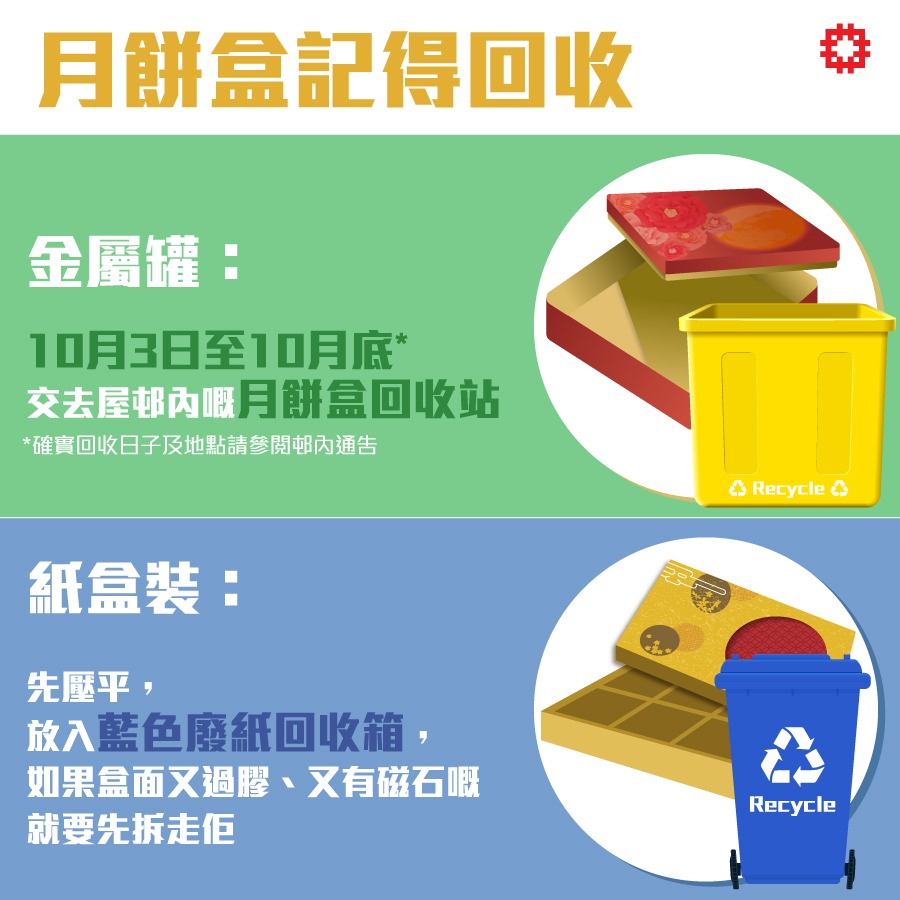 金屬罐:10月3日至10月底* 交去我哋轄下屋邨嘅月餅盒回收站,循環再造