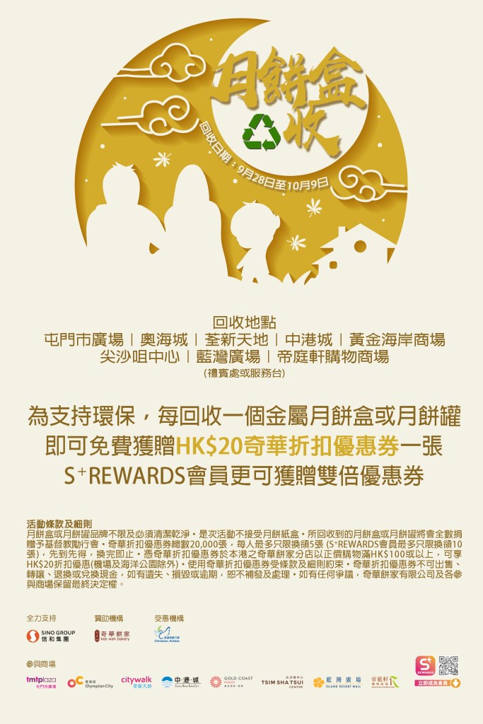 奇華餅家今年再度與信和集團旗下商場合辦月餅罐回收活動,憑任何品牌月餅鐵罐(任個品牌但需清潔乾淨)交到指定信和商場禮賓處或服務台,即可免費獲贈 HK$20 奇華折扣優惠券 1 張#, S+ REWARDS 會員將獲得雙倍優惠券。