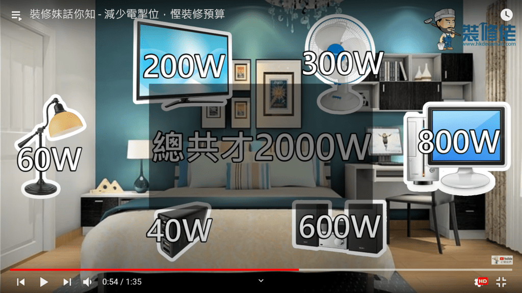 一間睡房所有電器加起來,也只需要2000W。即只需要一個掣位加一塊拖板,即可滿足所有用電需求。