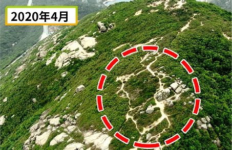其實觀景台的景色已甚為可觀,但為求「站得更前」,不少人越過圍欄走出觀景台外的大石上拍照,觀景台對出的斜坡踩出數條「打卡小路」,年多之間,小路日漸變寬及表土退化,甚至影響原有觀景台的可觀性,吸引更多人自行開發理想的景觀位。