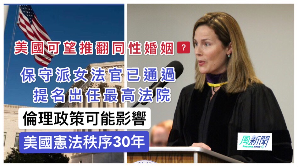 美國總統特朗普通過提名聯邦上訴法院女法官巴雷特(Amy Coney Barrett)出任最高法院大法官,最高法院有意在保守派大法官佔多數的優勢之下,將來可望推翻同性婚姻。