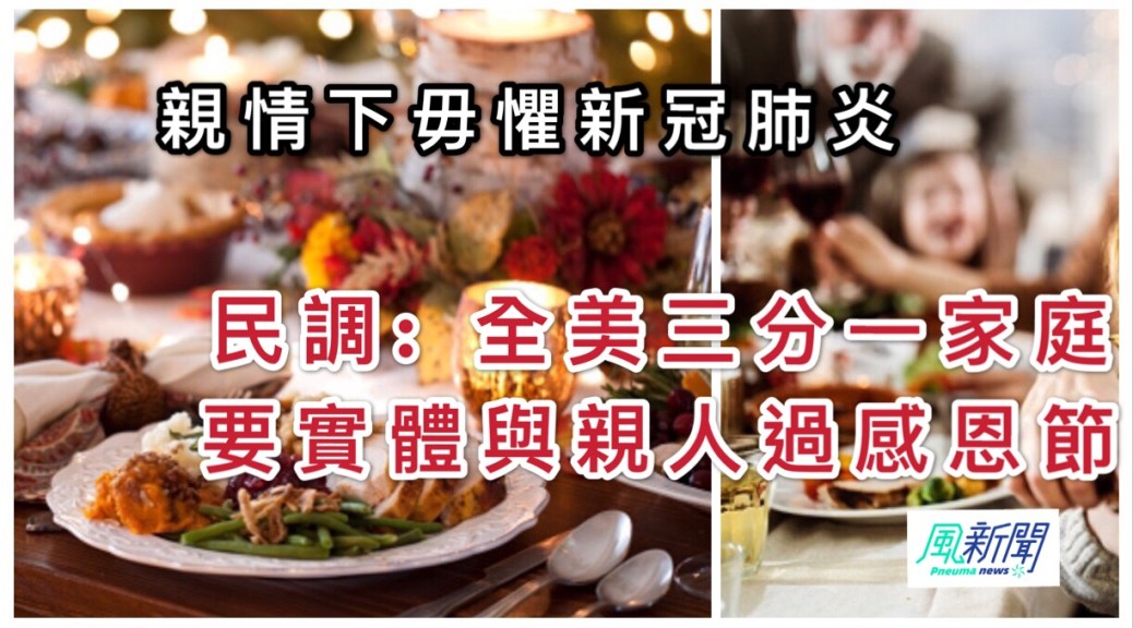 美國人今年為了慶祝感恩節,他們不會考慮「社交距離」,一於親情至上。根據最新的全美民調,三分之一的家長認為,全家待在一起度過感恩節的時光相當重要,即使有可能因此增加染上新型冠狀肺炎的風險,或加速病毒傳播也沒關係;民調中還顯示,在政府的呼籲下,仍有61%的家庭計劃在今年感恩節團聚,而不採線上團聚的方式度過感恩節。